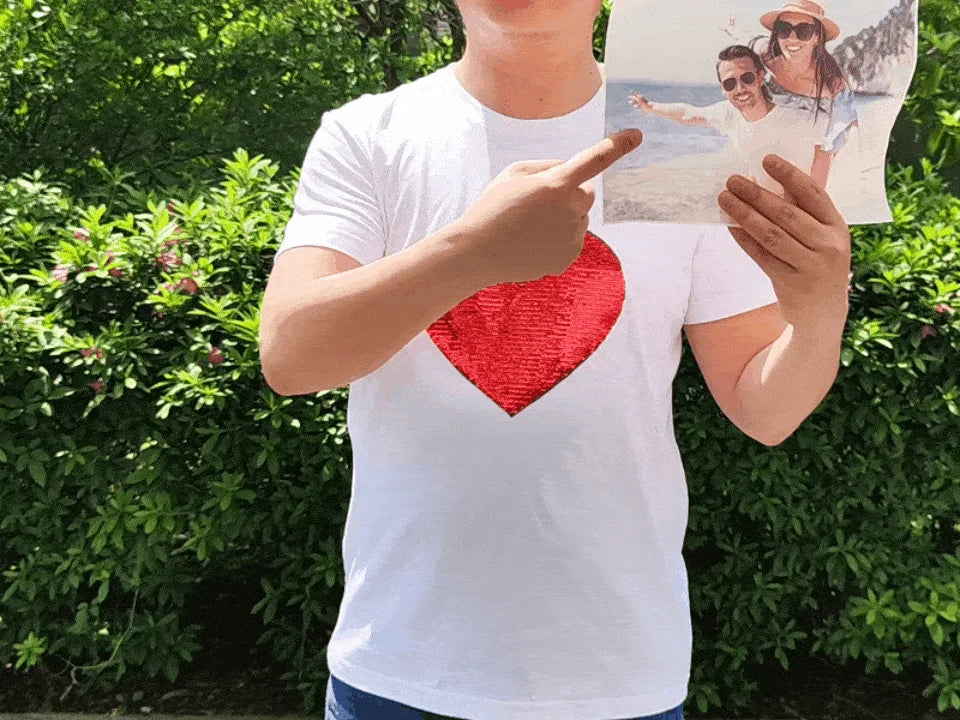 💗Découvrez notre t-shirt photo pailleté personnalisable, un ajout parfait à votre garde-robe ! Ce t-shirt unique présente un design éblouissant en forme de cœur composé de paillettes scintillantes. Ce qui le distingue, c'est que vous pouvez révéler une photo personnalisée en faisant glisser doucement les paillettes vers le haut, tandis qu'un glissement vers le bas révèle une surface scintillante solide.